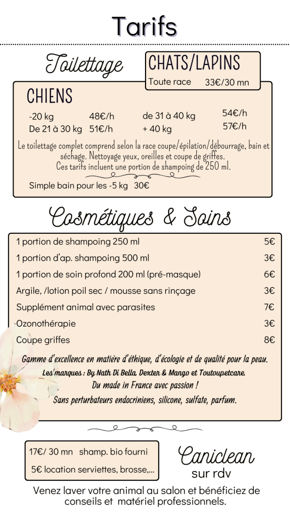 Le toilettage est facturé en fonction du temps consacré. Une facturation plus juste et représentative du travail accompli.